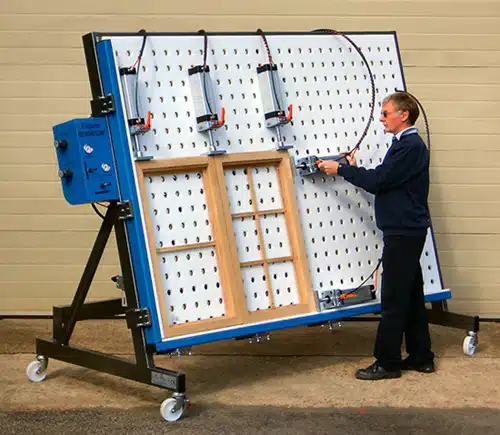 Cadreuse avec vérins pour panneaux perforés, proposée par le fabricant de la soudeuse à bois Tregarne. Cette cadreuse est disponible en format vertical (comme illustré) ou horizontal. Sa conception robuste assure un serrage uniforme et constant pour toutes les applications. Les vérins pneumatiques robustes de 80 mm d’alésage permettent de travailler sur des joints de portes de cuisine de petite taille, même dans les applications les plus exigeantes, telles que les encadrements de fenêtres et de portes. Des versions spéciales et des pinces sur mesure peuvent également être conçues et fabriquées pour répondre à vos besoins. Fortes de plus de 70 ans d’expérience en matière de serrage, nos concepteurs ont conçu ces pinces pour durer et nous sommes certains qu’elles dépasseront vos attentes. Dimensions standard : capacité de 1 000 mm x 2 250 mm Capacité de 1 500 mm x 2 250 mm Dimensions et versions spéciales disponibles • Pince haut de gamme • Face en plastique en option, utilisable avec le Tregarne WoodWelder • Design moderne • Vérins robustes de série • Régulateurs de pression, régulateurs et manomètres latéraux et supérieurs séparés • Vannes de régulation à 3 positions • Fourni avec des roulettes verrouillables pour une mobilité accrue • Emplacement et dispositif de verrouillage uniques du vérin • Compatible avec le WoodWelder pour des niveaux de production élevés